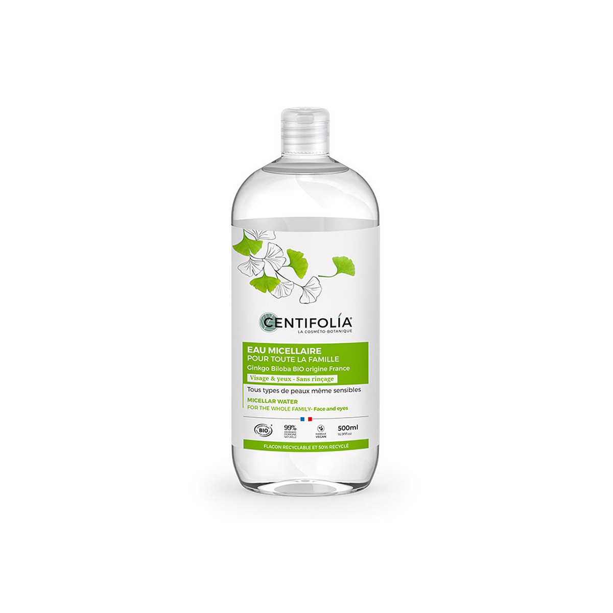 Ginko biloba je drvo poreklom iz Azije. To je najstarija poznata porodica drveća, stara 27 milijardi godina. Listove ovog veličanstvenog drveta karakteriše visoka koncentracija flavonoida, koji su glavni izvori antioksidanata. Zbog toga je Centifolia odlučila da ovaj ekstrakt uključi u svoju micelarnu vodu za celu porodicu*. Takođe poznat po svojim umirujućim svojstvima, ekstrakt ginka bilobe čini micelarnu vodu idealnom vodom za nežno čišćenje i osvežavanje kože cele porodice*. Koža je savršena bez nečistoća i šminke. Njena nežna formula poštuje prirodnu ravnotežu kože i ne iritira oči. Koža je sveža, umirena i blago mirisna. Voda je dermatološki i oftalmološki ispitana.